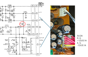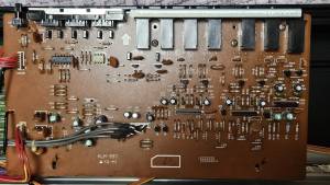 아날로그 양전원의 대칭이 잘 맞지 않는다. +11.78V, -12.03V로 측정되었다. 부하로 연결되는 커넥터 CN7A와 CN8A를 제거해도 측정된 전압이 그대로인 것으로 보아 전원회로를 구성한 부품이 오랜 시간이 지나면서 특성이 변동된 것으로 보인다. 이러한 비대칭 전원전압이 잡음의 원인인지는 아직 확실하지 않다. 외관을 살펴보았을 때 열이 발생하였거나 누액 또는 부식이 있었던 흔적은 전혀 없이 매우 깨끗하므로, 전원 보드의 일부 부품을 바꾼다 해도 무엇이 대상이 될지는 알기 어렵다.