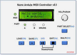 별도의 조절 장치를 갖고 있지 않은 GM sound module의 활용도를 높이기 위한 Arduino Nano 기반의 MIDI Controller(Nano Ardule)를 제작한다. Ardule은 Arduino + Module의 합성어이며, 프랑스어로 ‘어려운’(arduous)이라는 뜻도 갖고 있다. 2개 프로그램의 layer/split이 가능하며, 음색 설정을 user program/combi 형태로 microSD 카드에 저장하고 로드할 수 있다. 또한 카드에 저장된 type 0 MIDI 파일을 재생하는 기능도 갖고 있다. 이 프로젝트는 GM 명령어를 공부하고 아두이노의 활용법을 익히기 위한 목적도 있다.