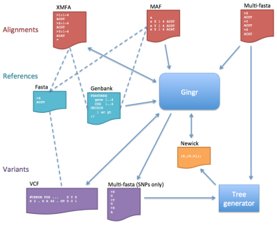 Gingr은 parsnp가 만들어내는 출력물 외에도 다양한 포맷의 파일을 import 또는 export할 수 있다. 패키지에 포함된 명령행 프로그램인 harvesttools도 같은 기능을 한다. Gingr이 다룰 수 있는 파일 형식은 다음과 같이 다양하다(그림 원본 링크).